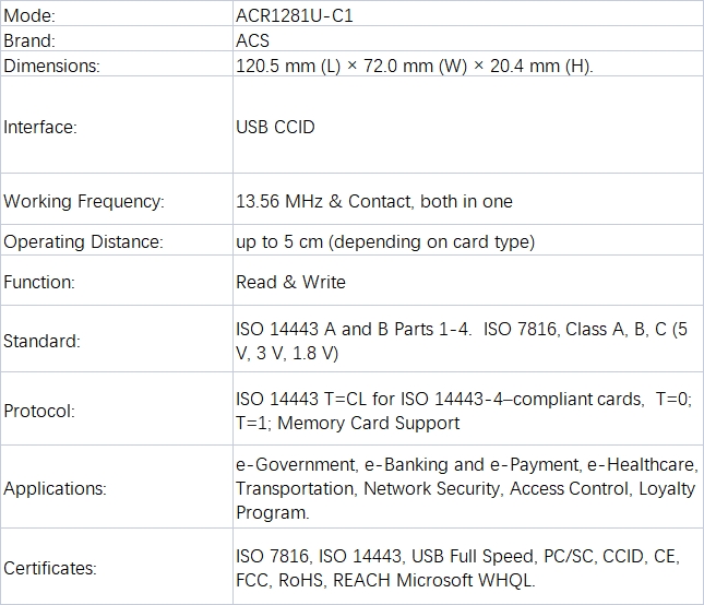 The ACS ACR1281U-C1 DualBoost II is the next-generation dual-interface smart card reader from ACS, building on the success of the ACR128 DualBoost Reader. This advanced smart card reader supports both contact and contactless smart cards, fully complying with ISO 7816 and ISO 14443 standards. The ACR1281U-C1 DualBoost II enables seamless integration of contact and contactless technologies into a single device, making it the ideal solution for applications requiring versatile smart card access. With its dual-interface functionality, this reader simplifies smart card integration, allowing businesses and developers to streamline their systems using one device and one card.