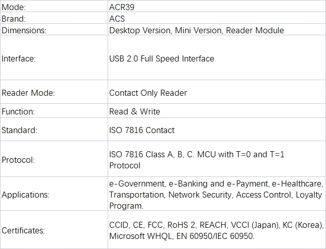 The ACS ACR39 PC-linked Smart Card Reader is an essential interface between a computer and smart cards, enabling seamless communication. Different types of smart cards use unique commands and communication protocols, often making direct communication with a computer difficult. The ACS ACR39 Smart Card Reader standardizes the interface, allowing for efficient interaction with various smart cards. By handling the technical complexities of innovative card operations, the ACS ACR39 Smart Card Reader frees software developers from managing these intricate details, allowing them to focus on implementing advanced smart card systems without being bogged down by low-level technicalities.