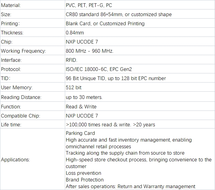 The NXP UCODE 8 and UCODE 8m ICs are the latest NXP products of the UCODE family. NXP UCODE 8/8m offers high performance and features for the most demanding RFID tagging applications. The NXP Ucode 8 UHF Card is widely used as a UHF Parking Card, Inventory and supply chain management, Process optimization, Brand protection/authentication, Automatic vehicle ID where no cryptography is required, Asset tracking, and Aviation spare part tracking.