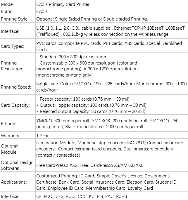 | Print Speed | Up to 200 cards/hour (single-sided) |