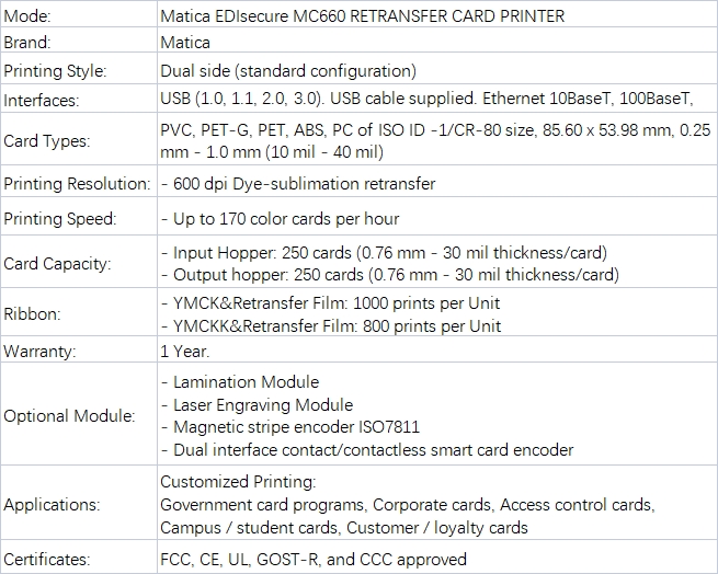 The Matica EDIsecure MC660 sets new standards in high-security card production with its 600dpi retransfer printing technology. Engineered for demanding card issuance environments, it delivers military-grade durability and photographic-quality output across all card materials, including PVC, PET, Polycarbonate, and ABS.