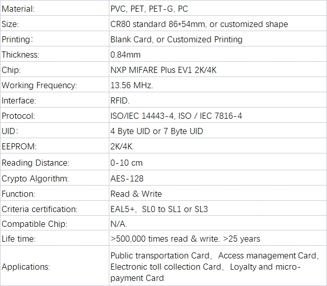 | Chip | NXP MIFARE Plus EV1 2K/4K (MF1P(H)x1y1) |
