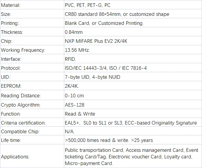 | Chip | NXP MIFARE Plus EV2 2K/4K (MF1P(H)x2 2K/4K) |